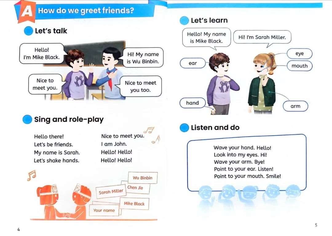 ①首先,“Let's talk”听说环节,不仅限于简单的对话练习,更鼓励学生通过真实的交流场景,掌握日常交际用语,如新同学见面时的寒暄与自我介绍。此外,该部分还巧妙融入了实际生活中的元素,使对话内容更加丰富、贴近学生日常。