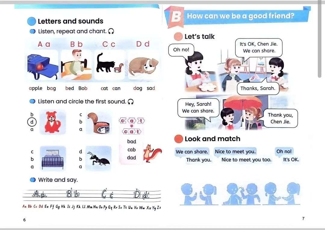 尤为值得一提的是,Part B显著地引入了“自然拼读”这一重要教学内容,通过“Letters and Sounds”字母和发音的学习,学生不仅能够掌握字母的基本形态,还能学习到字母的发音规律以及简单的CVC拼读技巧。这一变化标志着“自然拼读Phonics”正式成为英语教材不可或缺的一部分,为学生后续的识字认字之路奠定了坚实的基础。