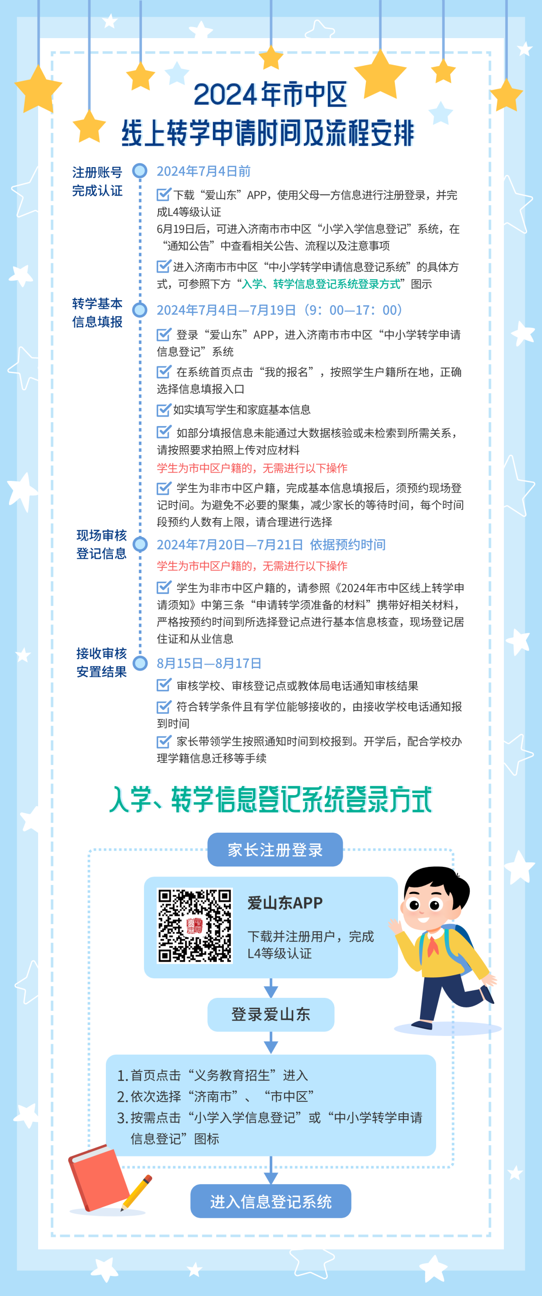 2024年历下区中小学学籍转入继续采用网上申请、大数据校验的办法。请家长用手机下载“爱山东”APP注册登记,并做实名四级(L4)用户认证。